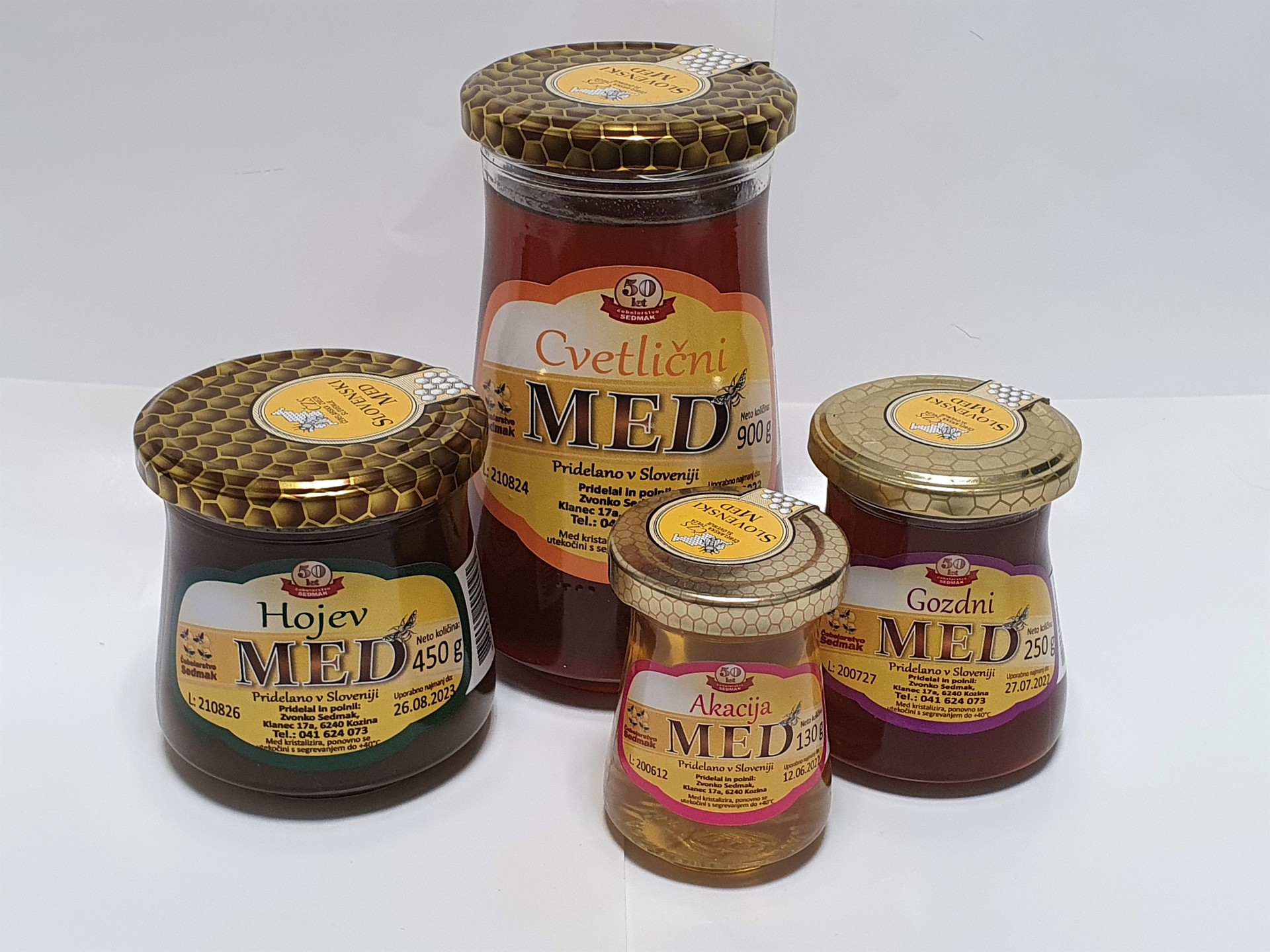 Ponujamo 8 vrst domačega slovenskega medu, vsakega v štirih različnih velikostih: 900g / 450g / 250g / 150g.